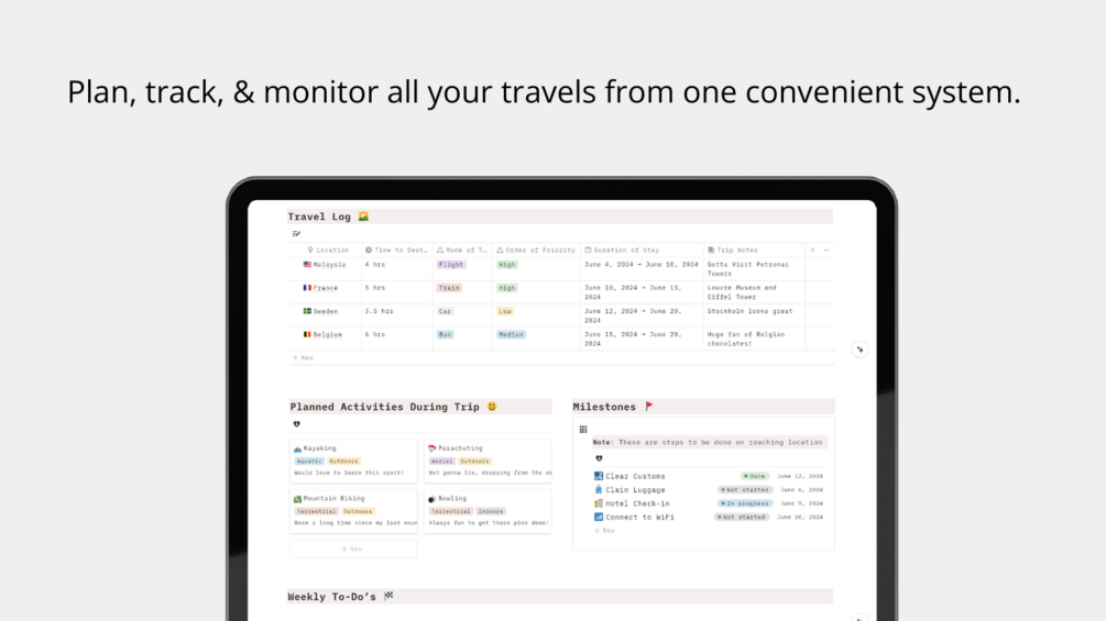 - Travel Log: A clean and simple database that hosts your itinerary, and is customizable if required.